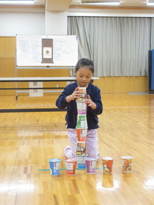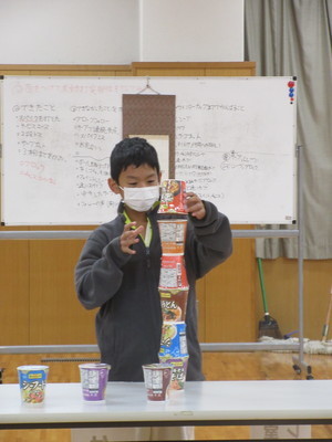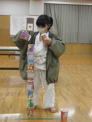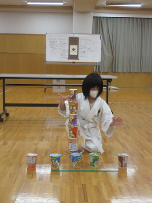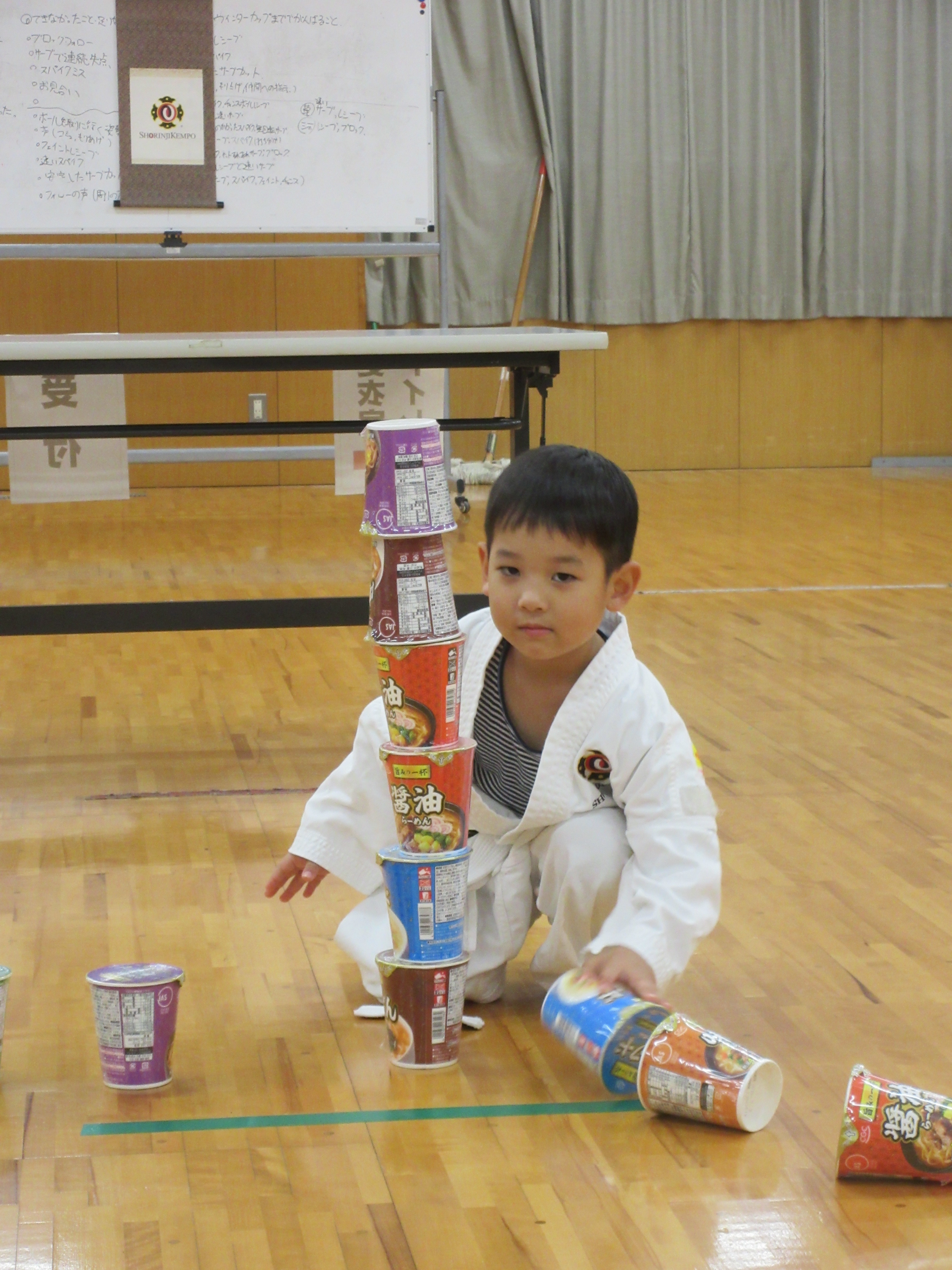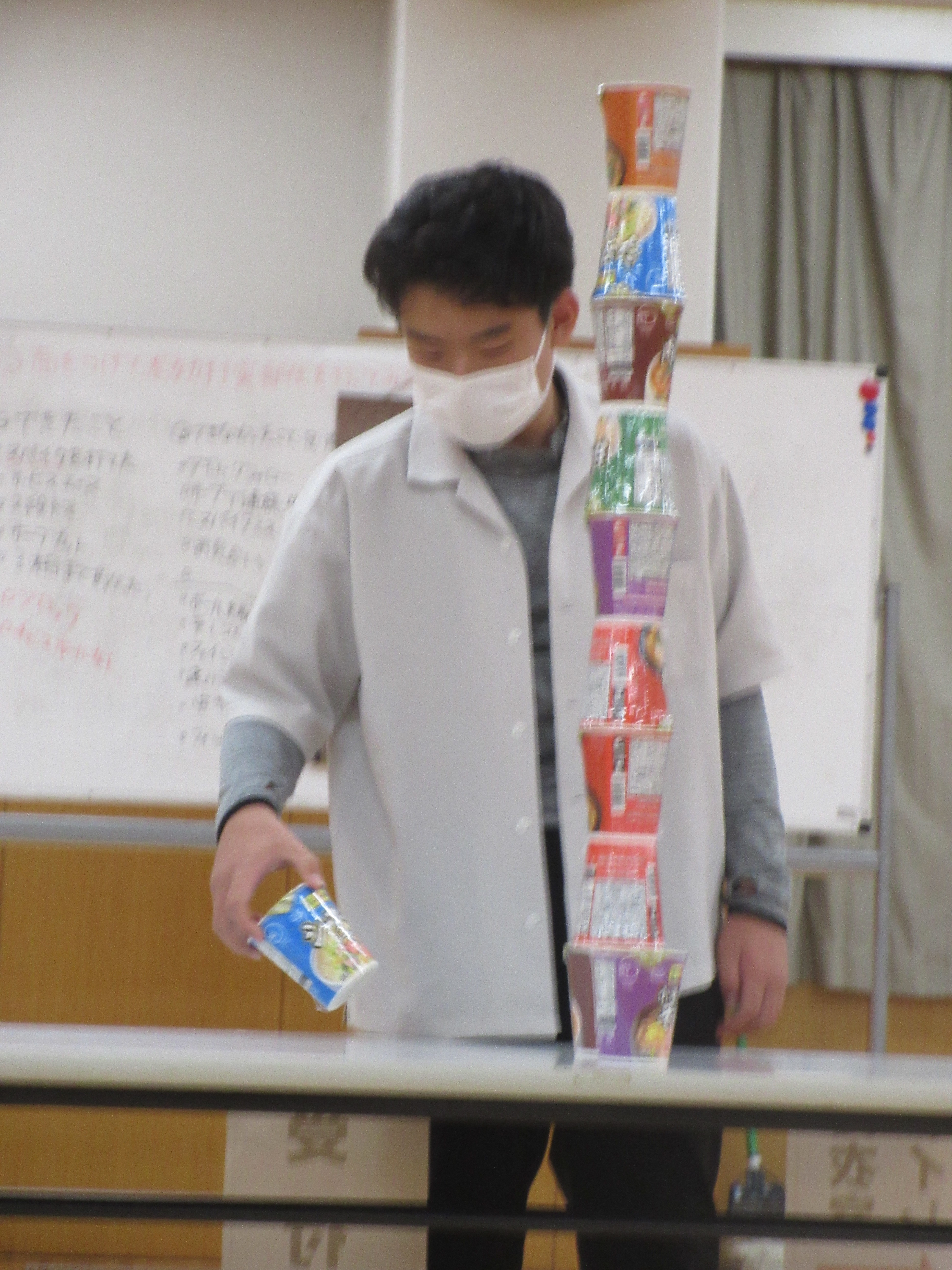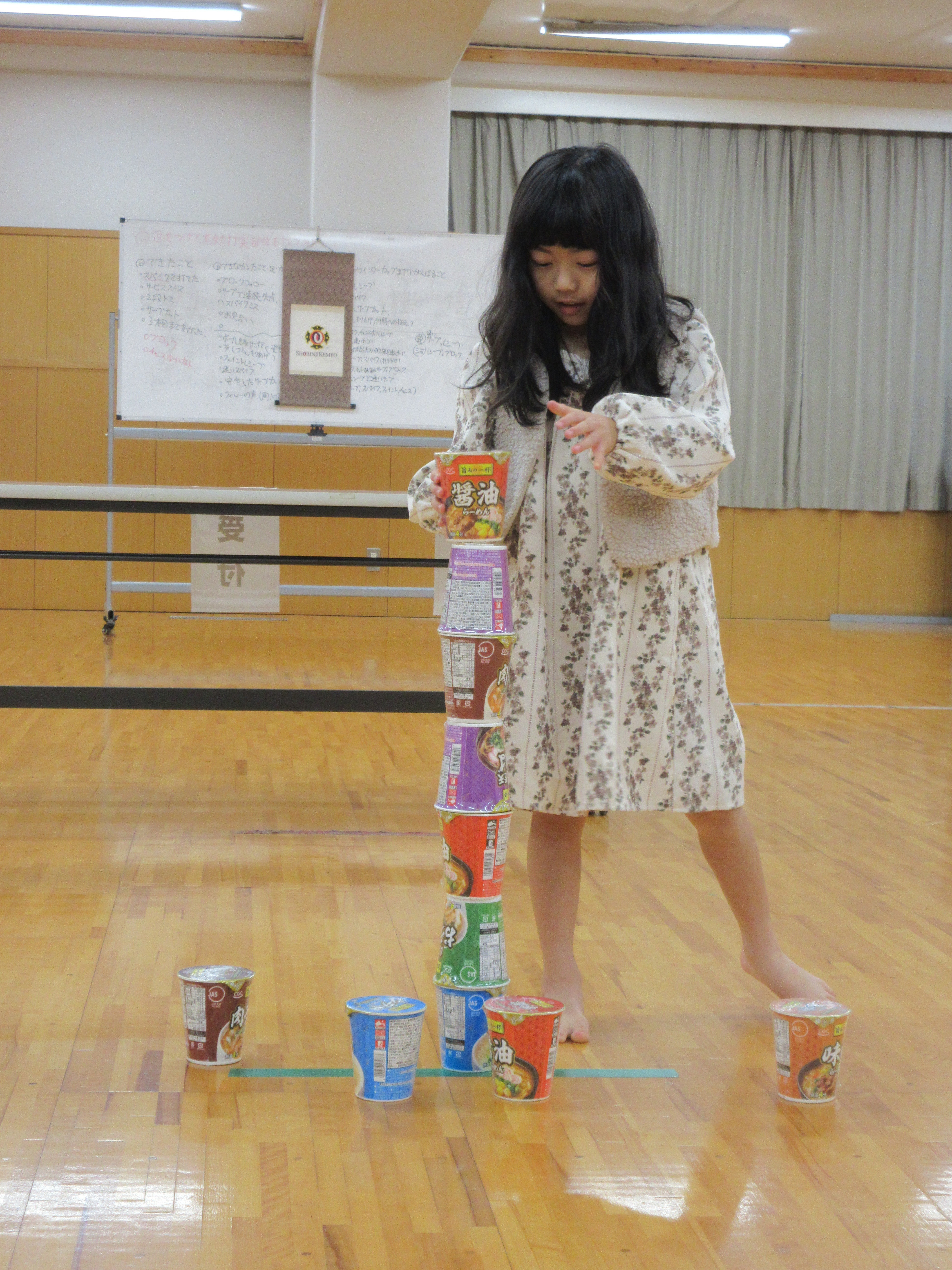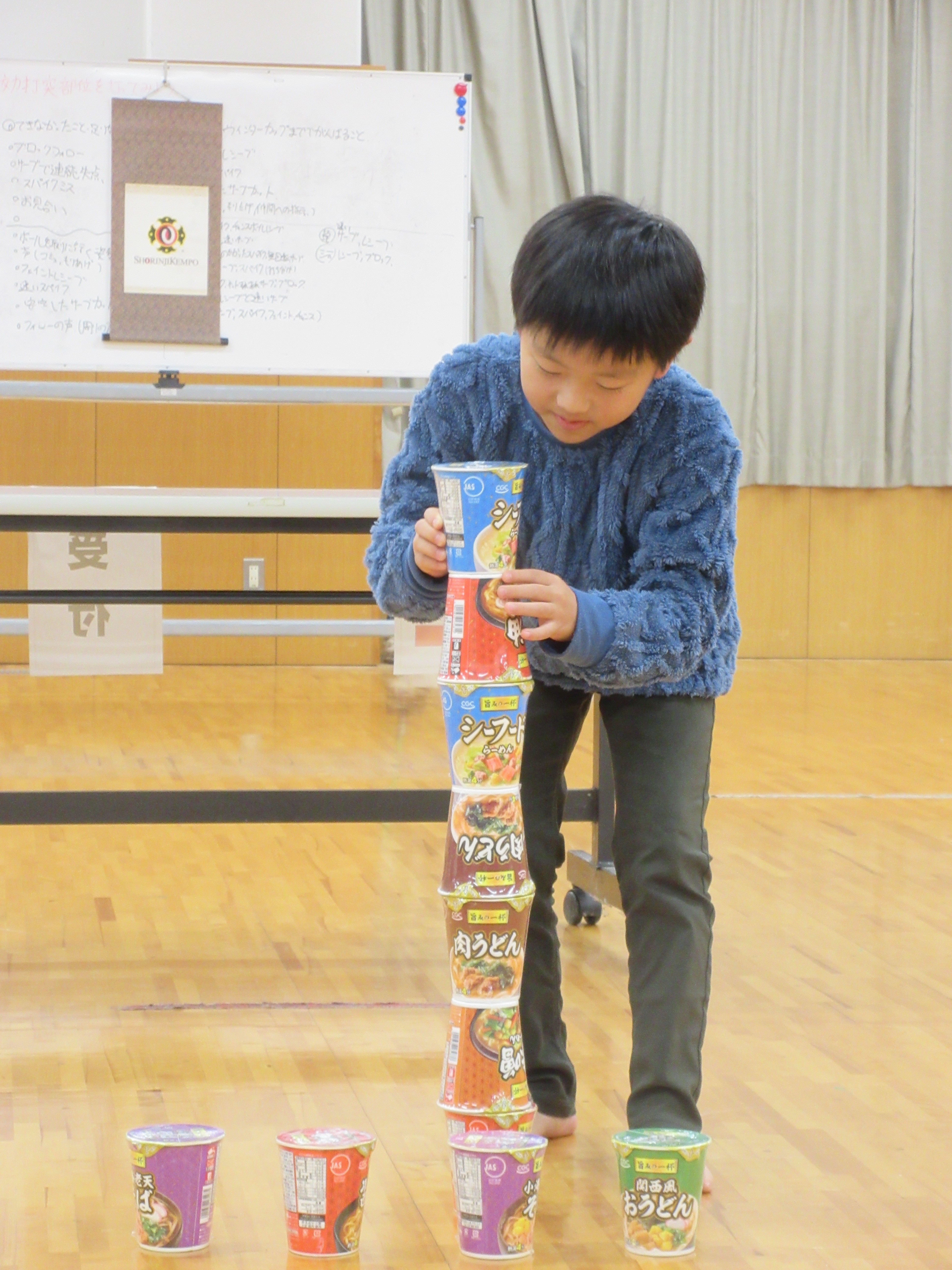 カップ麺をどれだけ早く、高く、積み上げるかの競争です。